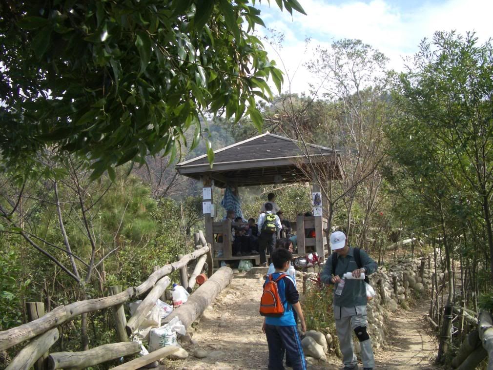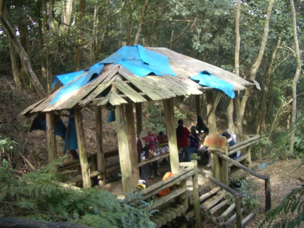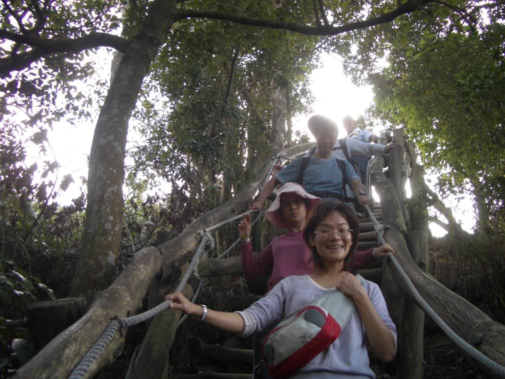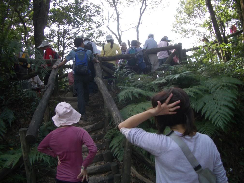 四號步道真的又陡又長...@#$% 中途有涼亭可以休息,爬得好累... 又來那麼長的一段路...@#$% 總算到一個置高點了,還有插旗子在這裡 走完上坡,改走下坡,也是很累的... 到吃午餐前的最後一個涼亭,遇到好幾車的遊客,卡在這裡了! 總算到吃午餐的涼亭了,風景不錯看 遠眺的風景,耶!那不是我們剛走過的吊橋嗎? 午餐要吃什麼呢?吃餅乾、吃飯團、喝奶茶...可惜忘了拍! 吃飽後就要攻山頂了,大家加油!待敘...つづく照例來個Flash展示一下唄!...